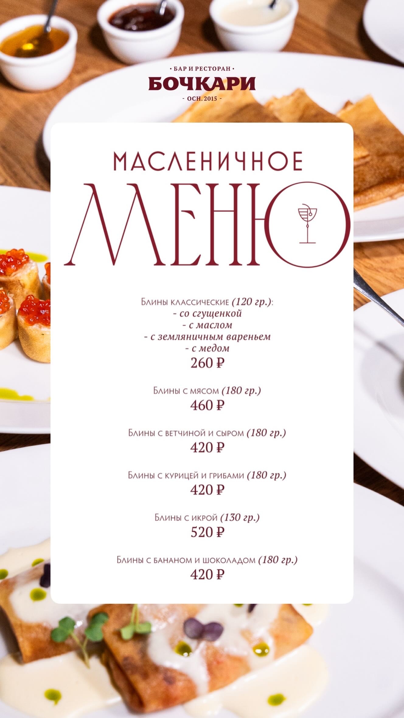 Совместно с водкой «ОНЕГИН» мы запускаем масленичное меню с классическими блинами и авторскими сочетаниями.